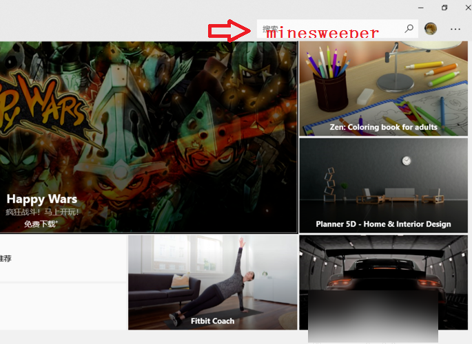2、在出现界面的搜索框中输入minesweeper,找到“Microsoft minesweeper”图标进行点击。