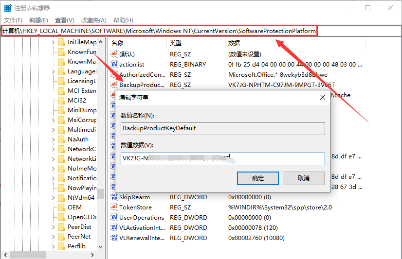 3、打开注册表,路径HKEY_LOCAL_MACHINESOFTWAREMicrosoftWindows NTCurrentVersionSoftwareProtectionPlatform,在右侧数值名称:BackupProductKeyDefault处就可以看到;