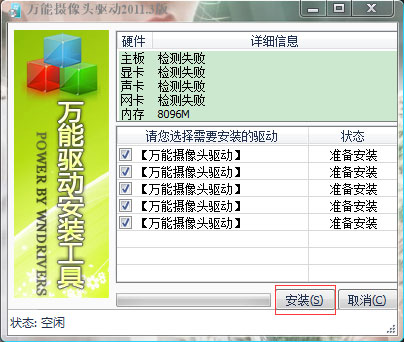 2、进入万能驱动摄像头安装界面,软件会自动检测您电脑的信息,点击【安装】就可以了;