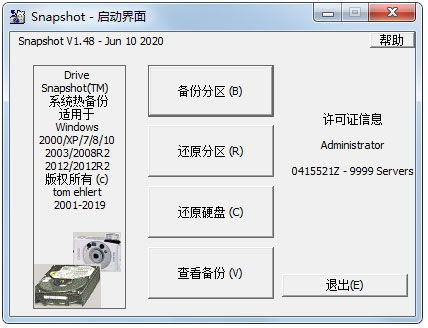 Drive SnapShot是一款完全免费的磁盘镜像备份工具,使用这款完全中文界面的Drive SnapShot软件可一键的将指定磁盘中的内容备份到另外一个镜像文件夹中。
