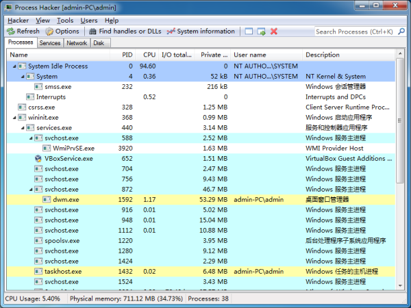 Process Hacker是一款功能丰富的系统程序。用户只要借助该程序就可以方便,快捷地查看相关进程的速度,内存,及模块等等,除此,还可以对相关的进程进行管理工作。