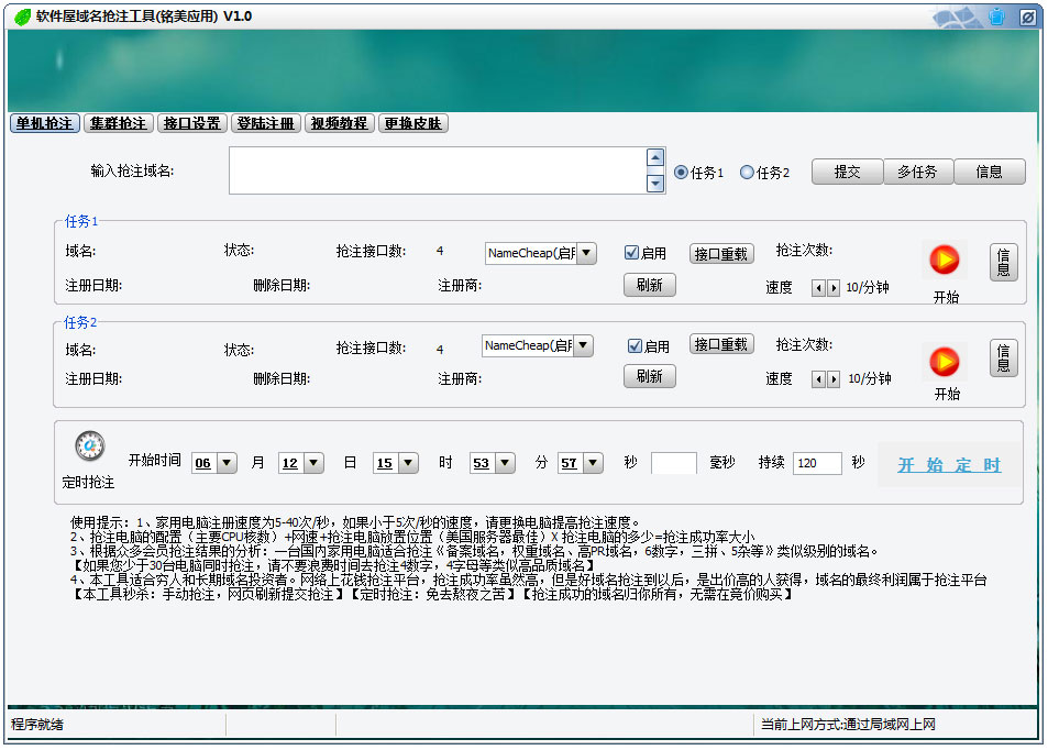 单机抢注的原理就是在预估的域名释放时间内,利用指定的API进行域名注册尝试,由于不同域名管理服务器释放域名的时间多在凌晨,且释放的时间极短,因此采用了定时注册尝试,这种模式的特点是定时精确性极高,可以精确到1毫秒,缺点是只能同时进行一种域名后缀的注册尝试。