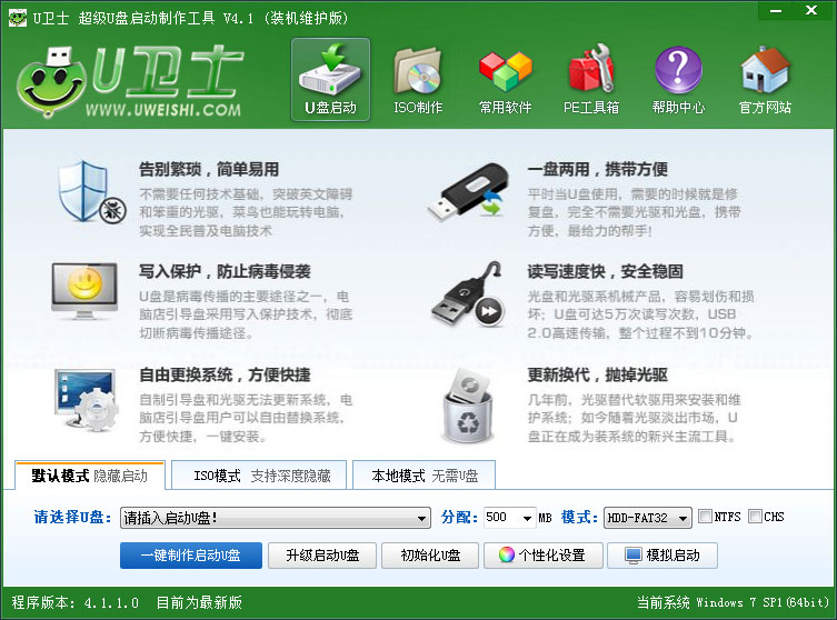 U卫士超级U盘启动盘制作工具是目前最快捷最方便的U盘安装系统的工具,适用于多种品牌的U盘,用户反馈均予以各种好评,便捷的操作方式一键制作。真正让人人都会安装系统,支持各种电脑机型及系统,教会你如何用u盘装XP系统,用u盘安装win7系统。