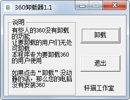 360卸载器是一款由轩猫软件工作室针对360安全卫士推出的卸载辅助工具。这款360卸载器界面小巧、操作简单,用户只需轻轻一点卸载,就能把电脑里的360安全卫士快速卸载,喜欢的用户可以下载体验!