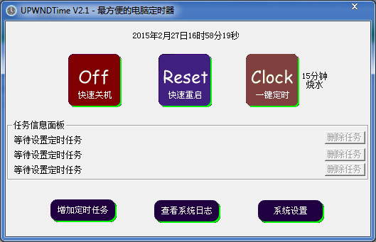 UPWNDTime 定时器支持快速关机、重启。 系统支持支持定时闹钟电话提醒用户功能。 系统支持定时闹钟、关机、重启,也支持超远程关机、重启。 支持健康功能保护视力,电脑每运行1小时会强制用户休息5分钟。 V2.1较之前版本更精简,突出定时器功能,更加方便快捷!