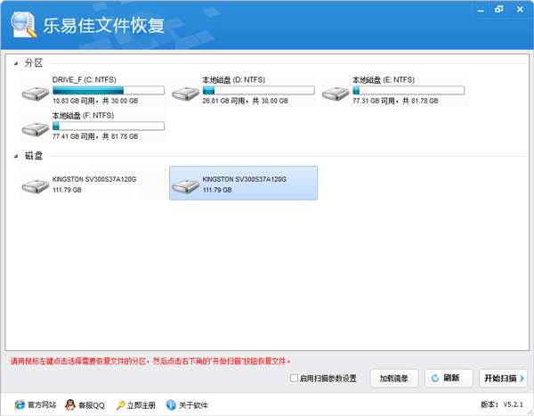 第二步、选择需要分析的分区,然后点“开始扫描”按钮。