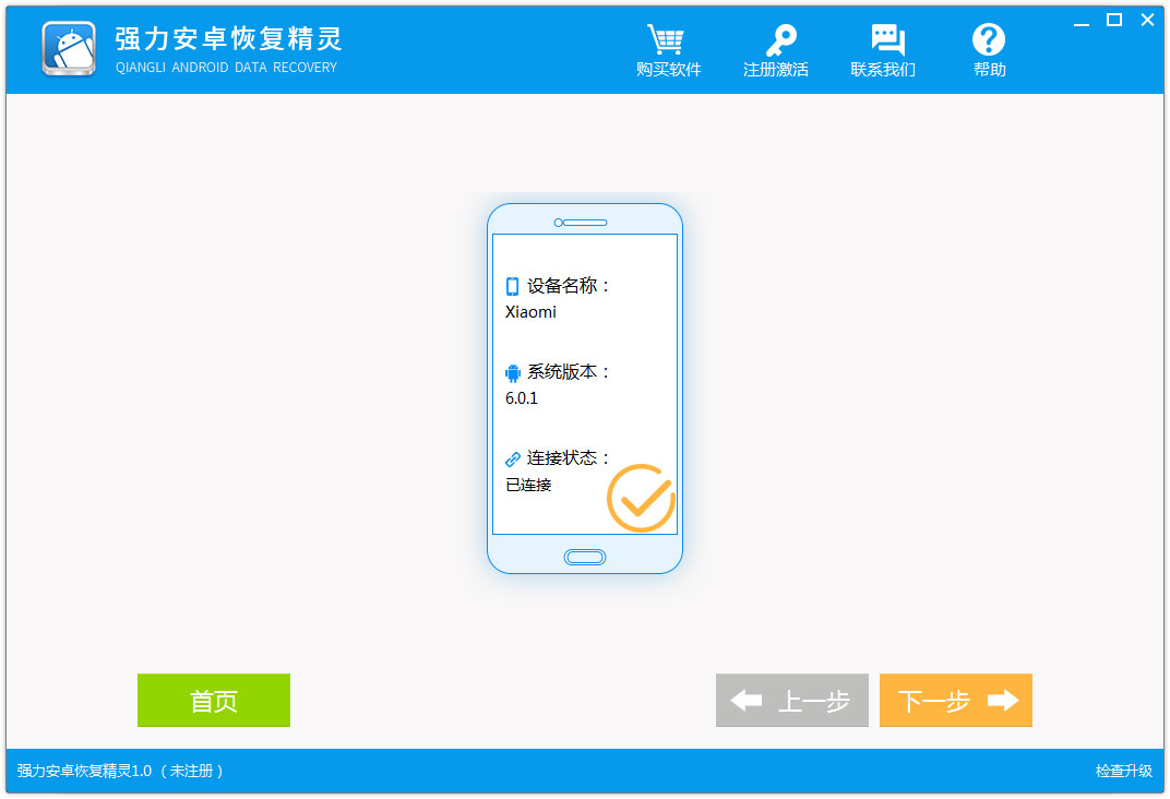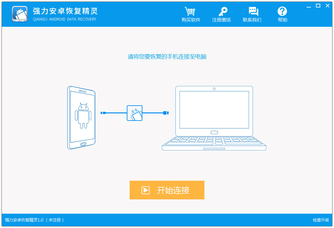 1、安装并运行强力安卓恢复精灵,同时将手机连接到电脑上,注:需开启手机USB调试模式,并获取手机Root权限,然后把手机和电脑用USB进行连接;