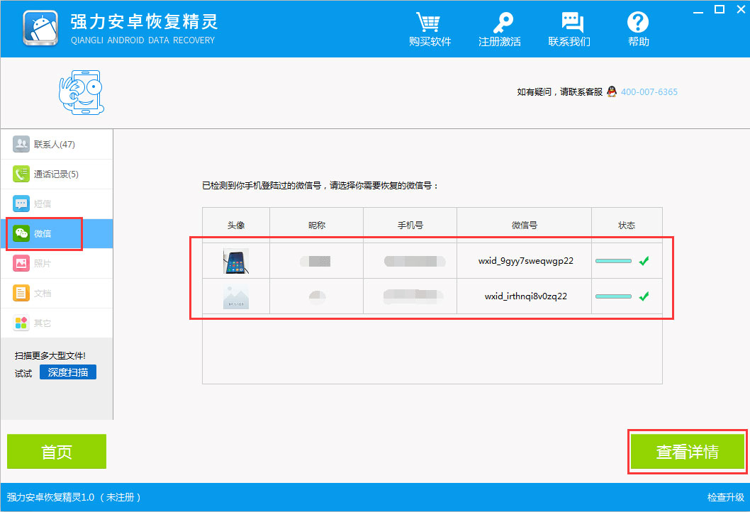6、借助强力安卓恢复精灵,则可恢复安卓手机微信聊天记录。若是重要的数据,建议大家做好备份处理。