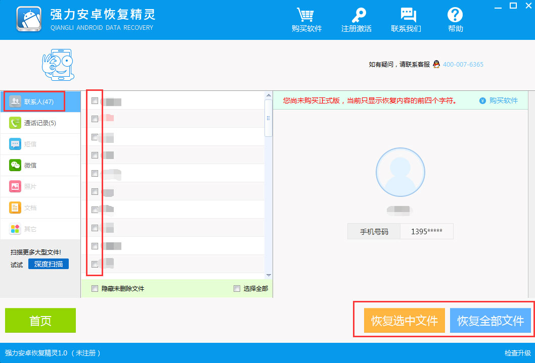 5、成功扫描后,可以在软件左侧看到数据类型,点击需要恢复的数据类型后,在右侧即可看到对应的数据。比方说需要恢复联系人信息,即可在左侧勾选联系人,点击“恢复选中文件”或“恢复全部文件”;