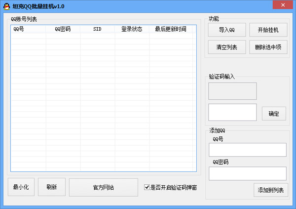 坦克QQ批量挂机(批量挂Q软件)是一款绿色免费的由坦克支官方推出的用于批量挂Q升级的软件。软件功能强大,支持批量/单个一键登录,可很直观的查看所挂Q号的状态,自动记忆所导入的帐号,最小化后台运行,不影响电脑使用,多线程优化,速度超快,是一款非常好的qq挂机软件。