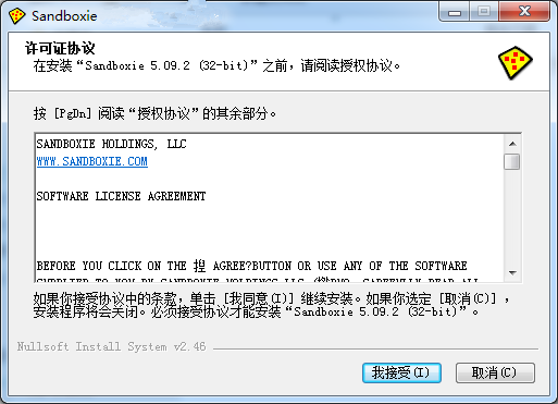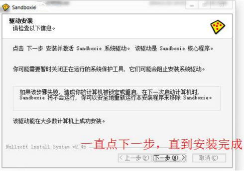 1、到本站下载安装sandboxie,打开安装程序,点击下一步继续安装;