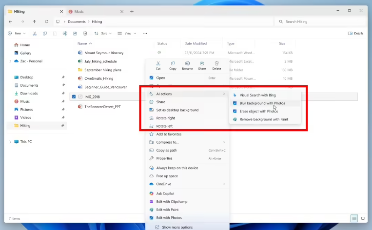 文件资源管理器:新增 AI 操作,可对图片进行“模糊背景”“移除物体”“去除背景”等操作,或为文档生成摘要(需 M365 订阅与 Copilot 授权)。同时提升了云端文件启动和右键菜单加载性能,并修复了图标重叠及阿拉伯语 / 希伯来语镜像显示问题。