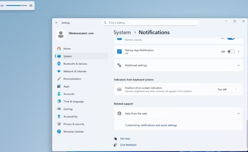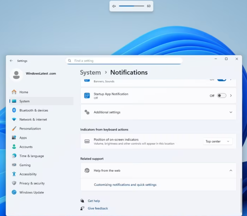 微软提升了个性化体验,用户现在可以通过“设置 > 系统 > 通知”中的新开关,自由地将这些指示器设置在屏幕的左上角、顶部中央或默认的底部中央三个位置。