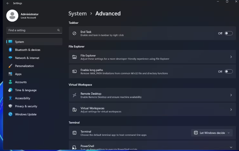 系统设置方面,原有的“面向开发者”页面被一个功能更全面的“高级设置”页面所取代。新页面不仅保留了将“结束任务”功能固定到任务栏等原有选项,还新增了多项实用功能,其中包括开启 MAX_PATH 支持,解决了“路径太长”的错误,允许文件资源管理器处理超过 260 个字符的长文件路径。
