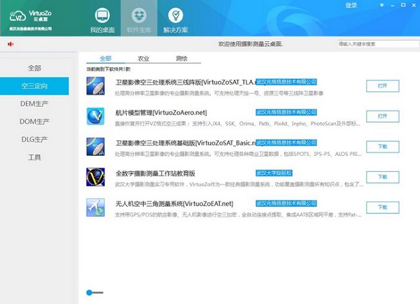 VirtuoZo云桌面(VirtuoZo.Net)是武汉兆格信息技术有限公司推出的摄影测量工具及相关资源在线获取平台。 它内置多款摄影测量全流程处理系统及大量实用工具,同时提供行业解决方案、软件文档、在线课程、技术论坛等一站式综合内容服务。