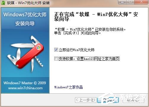 3、取消勾选“支持软媒,设置hao123网址之家为首页”,点击完成即可;