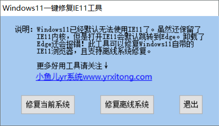 Windows11一键修复IE11工具是由大神制作的一款十分好用的系统工具,许多小伙伴都发现了,在Windows11系统中无法使用IE来了,但是这款软件就可以帮助用户快速的解决这个问题。有需要的小伙伴快来下载吧!