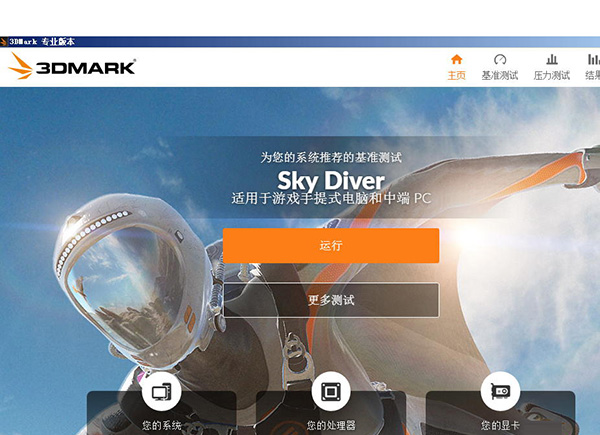 3DMark Sky Diver是一项DirectX 11基准测试,可用于游戏手提式电脑和中端 PC。使用3DMark Sky Diver对系统的主流显卡、移动设备GPU或集成显卡进行基准测试。对于在更严苛的Fire Strike测试中无法超过一位数帧速率的DirectX 11系统,这是理想的测试方案。Sky Diver 目前只支持Windows系统。